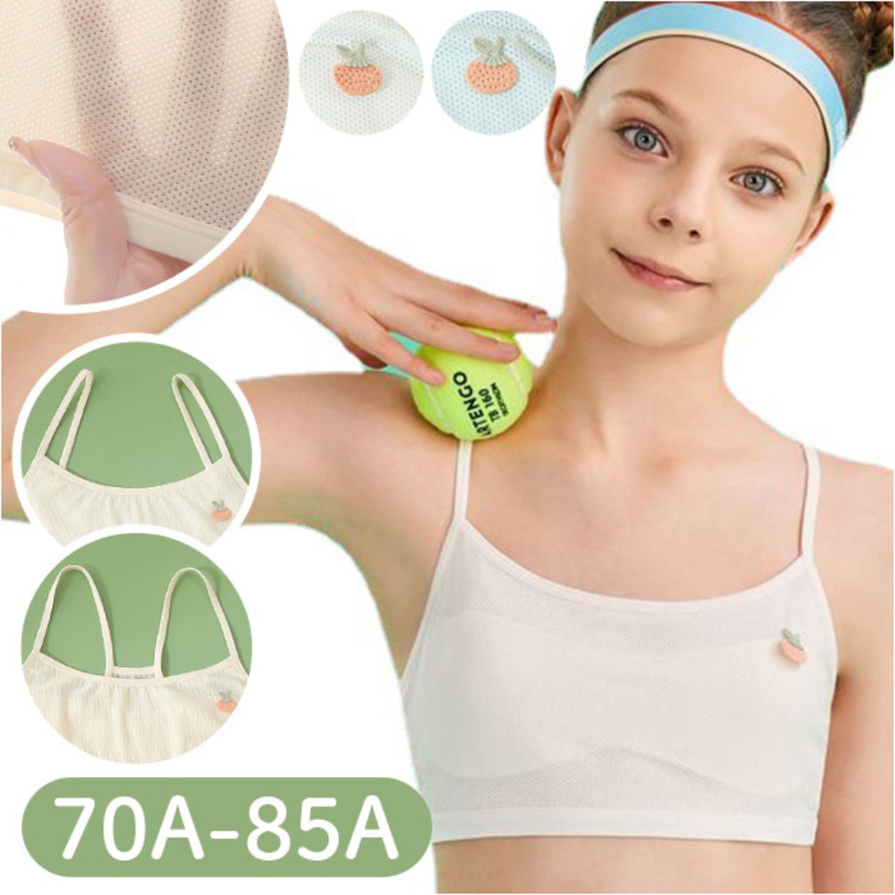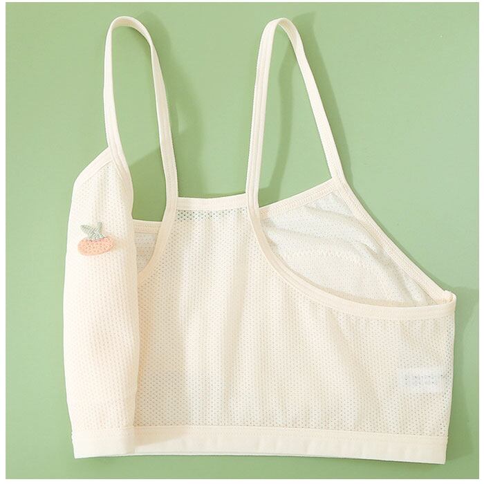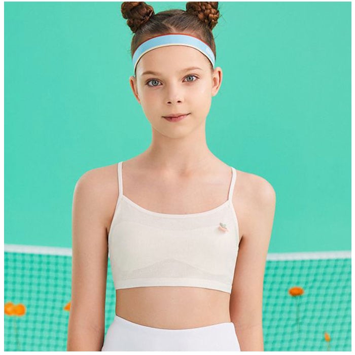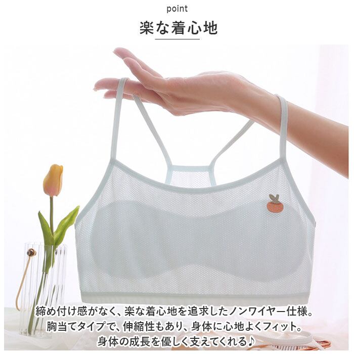 ・締め付け感がなく、楽な着心地を追求したノンワイヤー仕様。胸当てタイプで、伸縮性もあり、身体に心地よくフィット。身体の成長を優しく支えてくれる♪