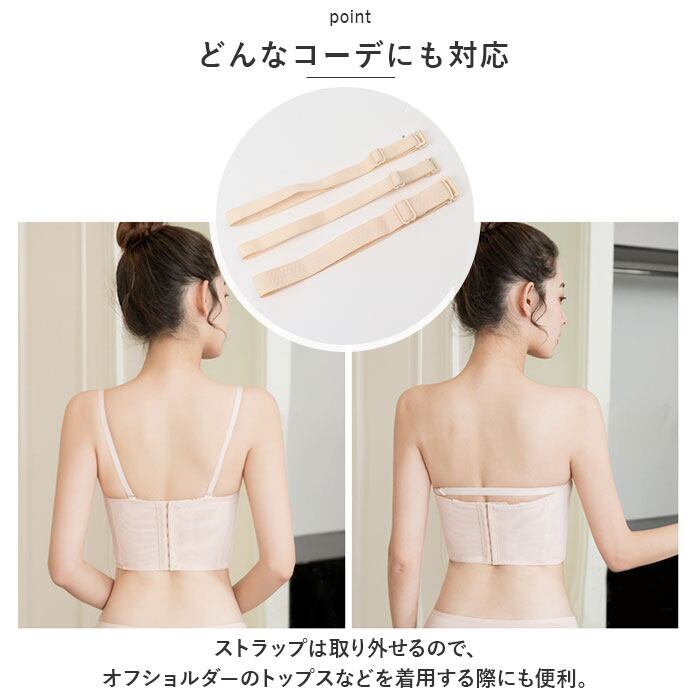 ・ストラップは取り外せるので、オフショルダーのトップスなどを着用する際にも便利。