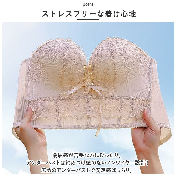 ・窮屈感が苦手な方にぴったり。アンダーバストは締めつけ感のないノンワイヤー設計!広めのアンダーバストで安定感ばっちり。