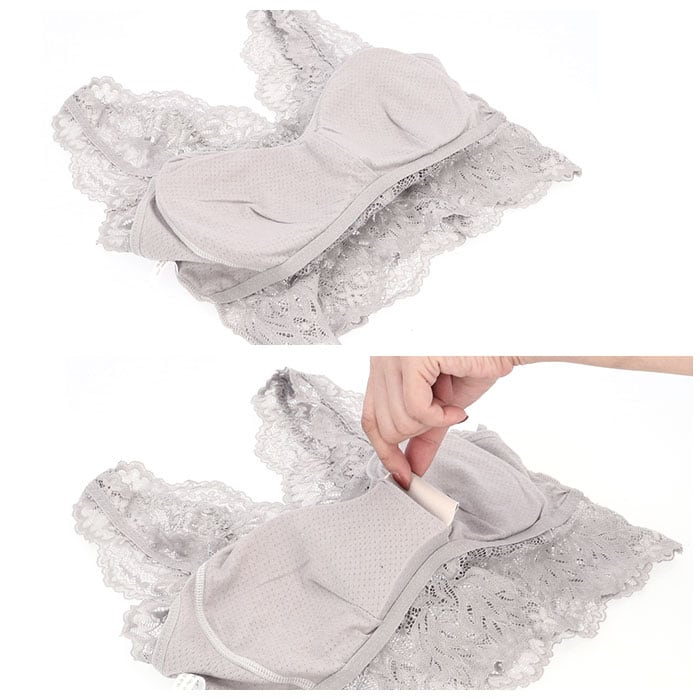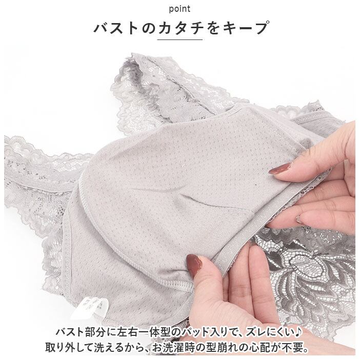 ・バスト部分に左右一体型のパッド入りで、ズレにくい♪取り外して洗えるから、お洗濯時の型崩れの心配が不要。