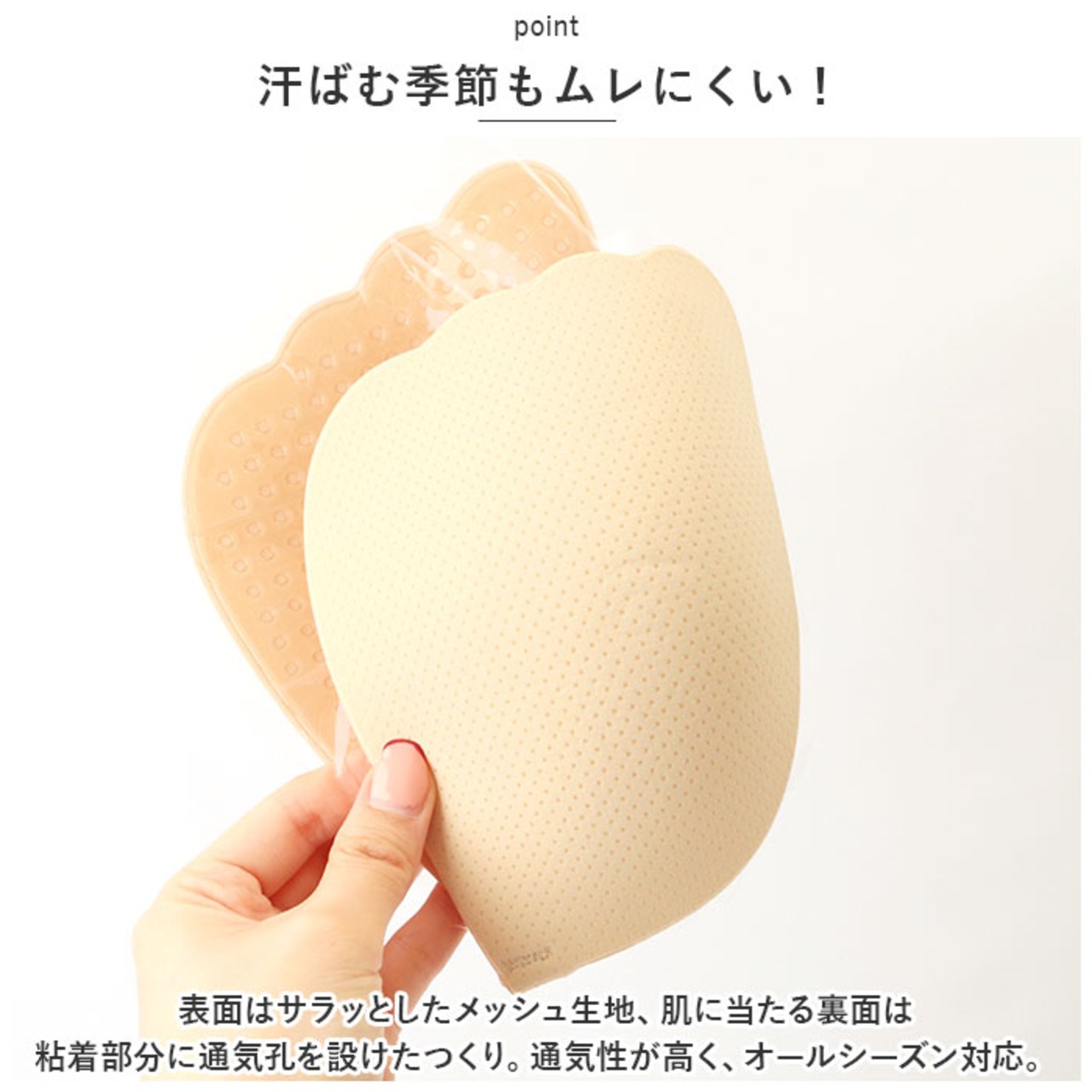 ・表面はサラッとしたメッシュ生地、肌に当たる裏面は粘着部分に通気孔を設けたつくり。通気性が高く、オールシーズン対応。