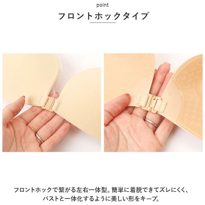 ・フロントホックで繋がる左右一体型。簡単に着脱できてズレにくく、バストと一体化するように美しい形をキープ。