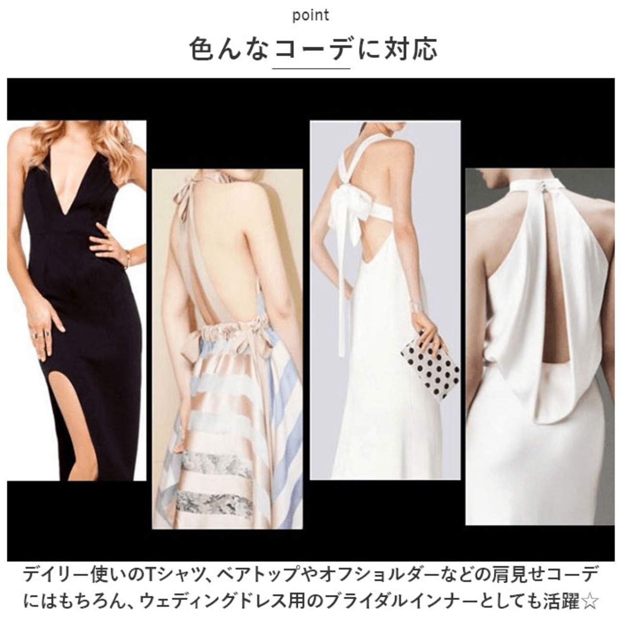 ・デイリー使いのTシャツ、ベアトップやオフショルダーなどの肩見せコーデにはもちろん、ウェディングドレス用のブライダルインナーとしても活躍☆