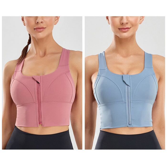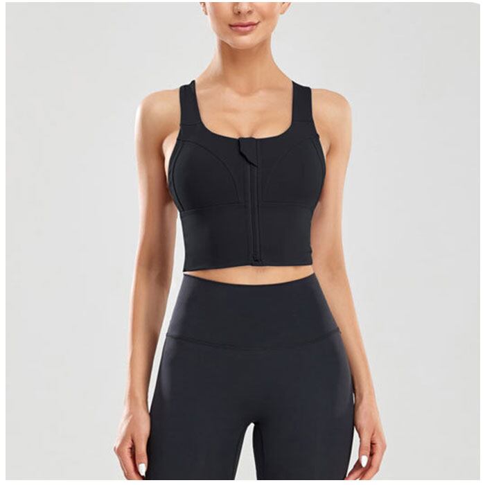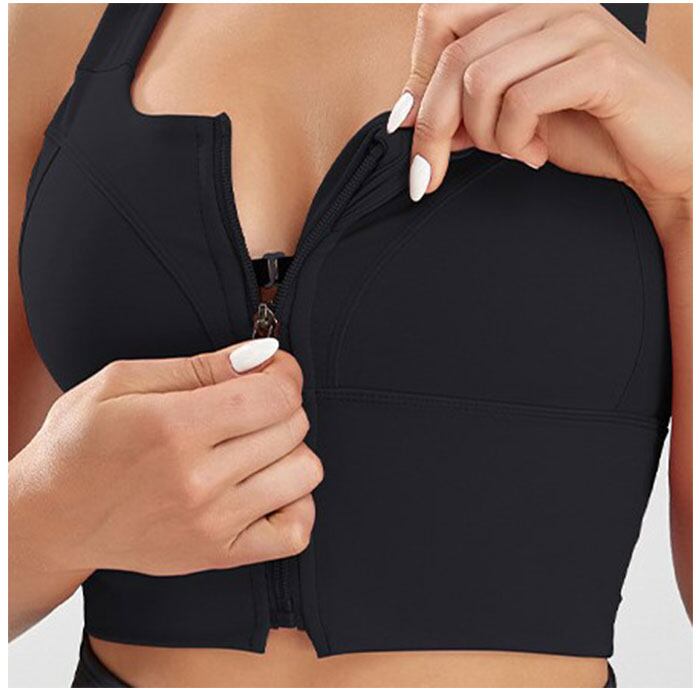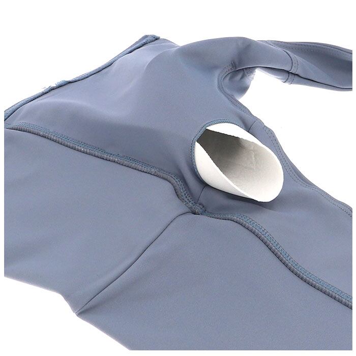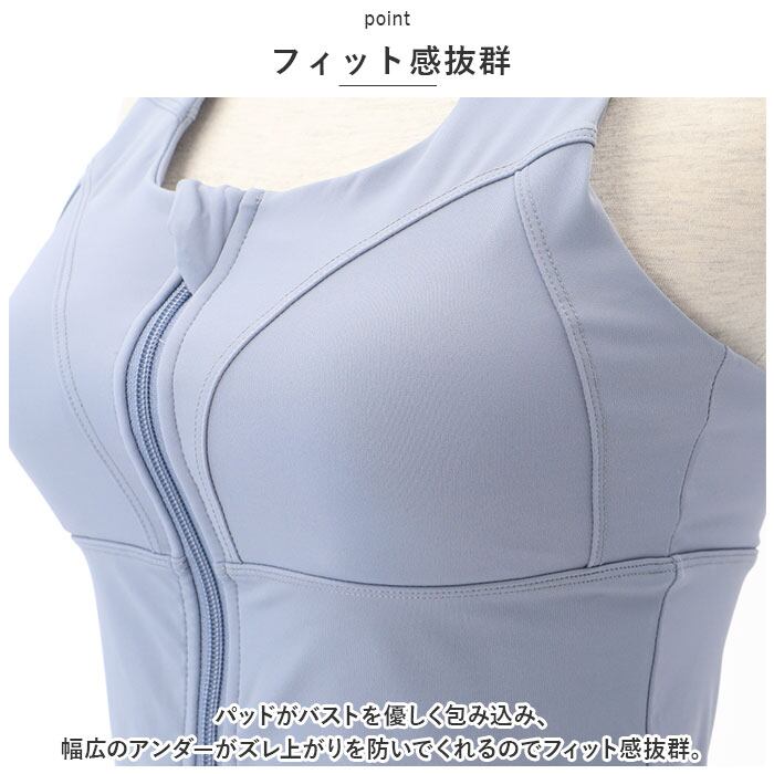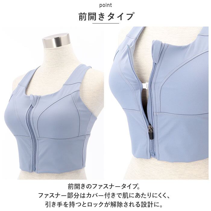 ・前開きのファスナータイプ。ファスナー部分はカバー付きで肌にあたりにくく、引き手を持つとロックが解除される設計に。
