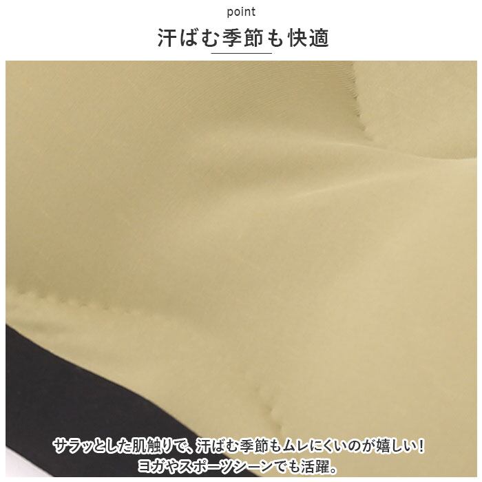 ・サラッとした肌触りで、汗ばむ季節もムレにくいのが嬉しい!ヨガやスポーツシーンでも活躍。