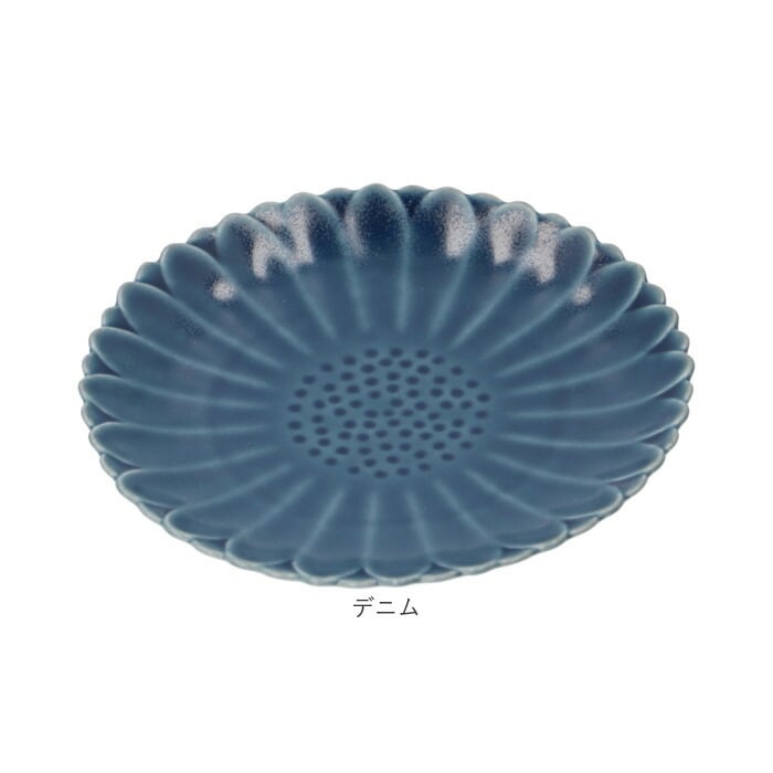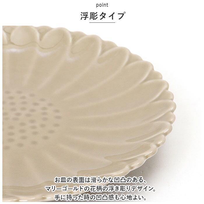 ・お皿の表面は滑らかな凹凸のある、マリーゴールドの花柄の浮き彫りデザイン。手に持った時の凹凸感も心地よい。