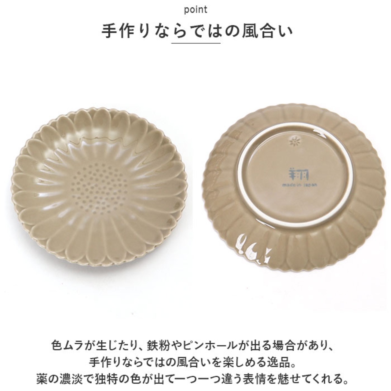 ・色ムラが生じたり、鉄粉やピンホールが出る場合があり、手作りならではの風合いを楽しめる逸品。薬の濃淡で独特の色が出て一つ一つ違う表情を魅せてくれる。