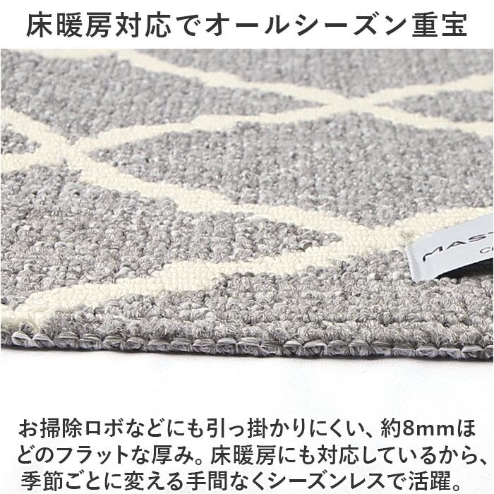 ・お掃除ロボなどにも引っ掛かりにくい、約8mmほどのフラットな厚み。床暖房にも対応しているから、季節ごとに変える手間なくシーズンレスで活躍。