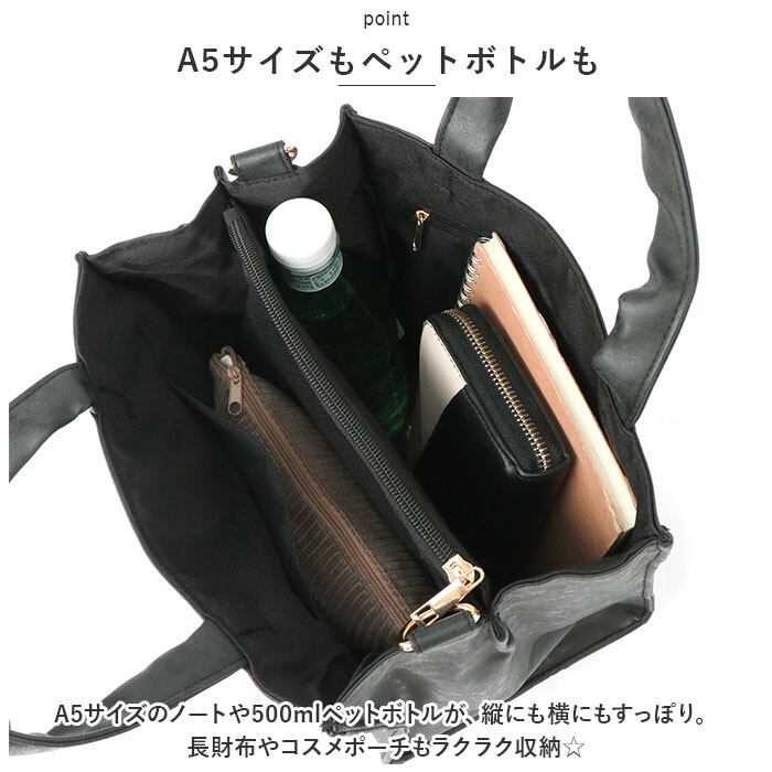 ・A5サイズのノートや500mlペットボトルが、縦にも横にもすっぽり。長財布やコスメポーチもラクラク収納☆