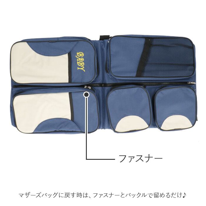 ・折りたたんでマザーズバッグとして使え、広げると簡易的なベビーベッドに変身!マザーズバッグに戻す時は、ファスナーとバックルで留めるだけ♪