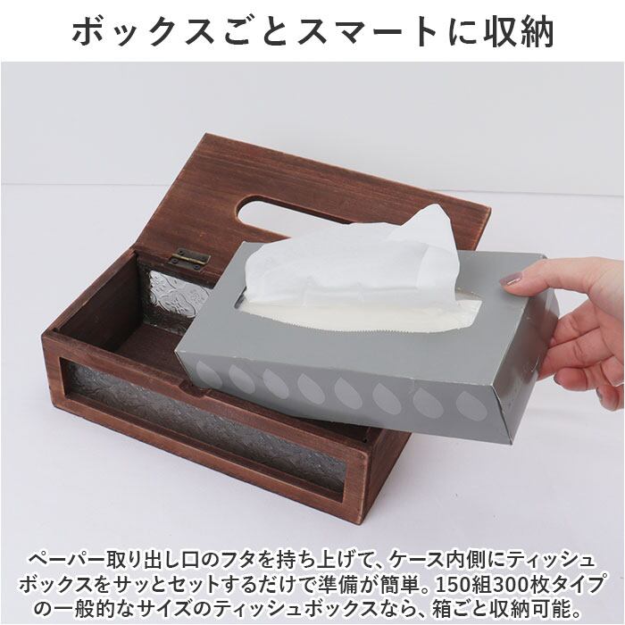 ※1.150組300枚タイプの一般的なサイズのティッシュボックスなら、箱ごと収納可能・・・(※全てのティッシュボックスには対応しておりません。形状が合わない場合は、ボックスからペーパーを取り出し、ケースに直接収納してお使いください。)