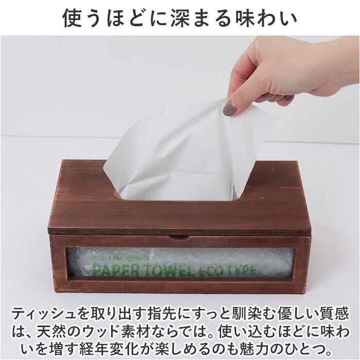 ・ティッシュを取り出す指先にすっと馴染む優しい質感は、天然のウッド素材ならでは。使い込むほどに味わいを増す経年変化が楽しめるのも魅力のひとつ。
