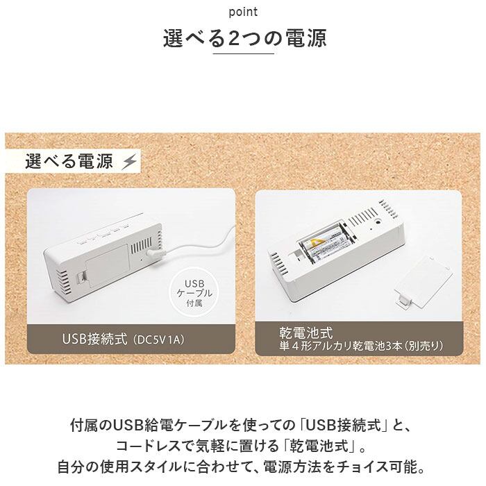 ・付属のUSB給電ケーブルを使っての「USB接続式」と、コードレスで気軽に置ける「乾電池式」。自分の使用スタイルに合わせて、電源方法をチョイス可能。(※単4形アルカリ乾電池3本使用。電池は別売りです。USB充電式ではありません。)