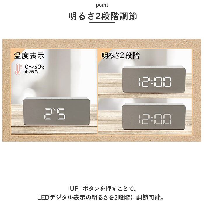 「UP」ボタンを押すことで、LEDデジタル表示の明るさを2段階に調節可能。