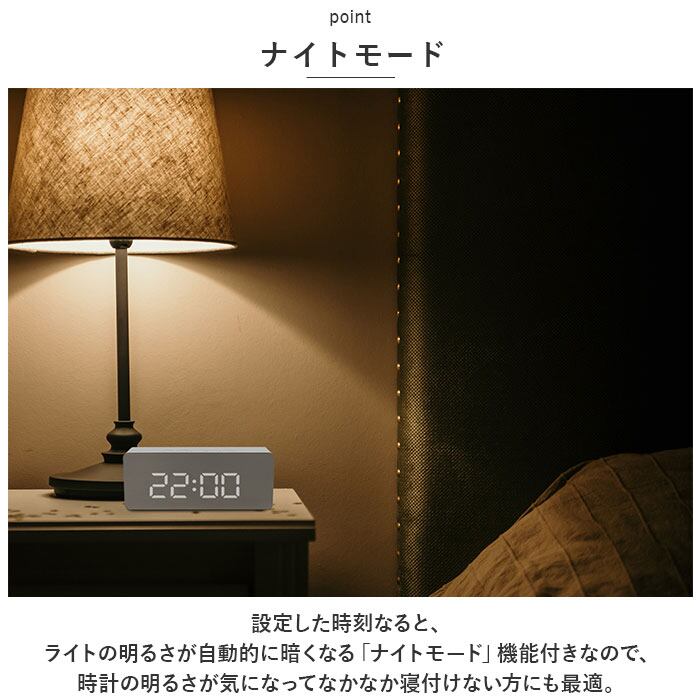 ・設定した時刻なると、ライトの明るさが自動的に暗くなる「ナイトモード」機能付きなので、時計の明るさが気になってなかなか寝付けない方にも最適。
