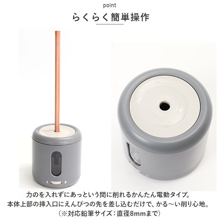 ・力のを入れずにあっという間に削れるかんたん電動タイプ。本体上部の挿入口にえんぴつの先を差し込むだけで、かる~い削り心地。(※対応鉛筆サイズ:直径8mmまで)