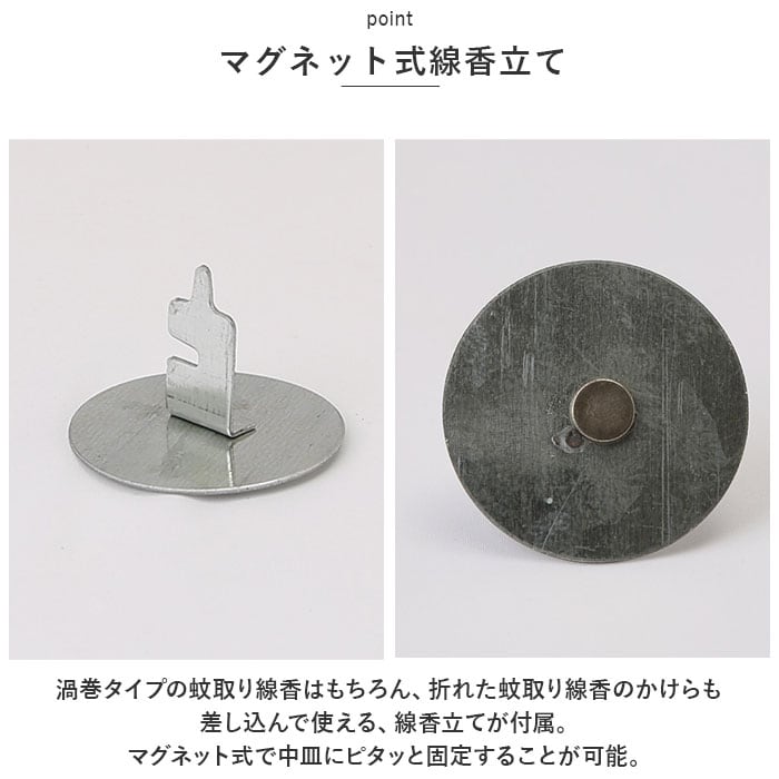 ・渦巻タイプの蚊取り線香はもちろん、折れた蚊取り線香のかけらも差し込んで使える、線香立てが付属。マグネット式で中皿にピタッと固定することが可能。