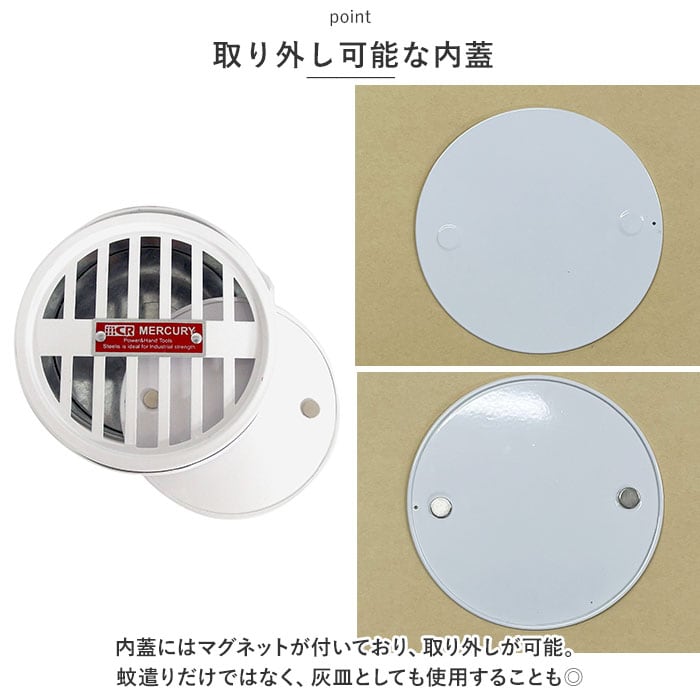 ・シルバーカラーの中皿下に、予備の蚊取り線香やライター、マッチなどを収納できるストックスペース付き。