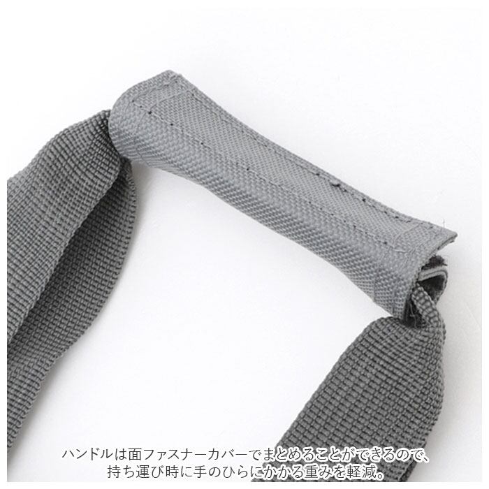・ハンドルは面ファスナーカバーでまとめることができるので、持ち運び時に手のひらにかかる重みを軽減。