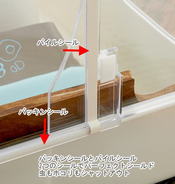 開閉式の便利なフードがついたプラスチック製の小物入れです。パッキンシールとパイルシールの2つのシールでホコリや虫から中身を守ってくれます。