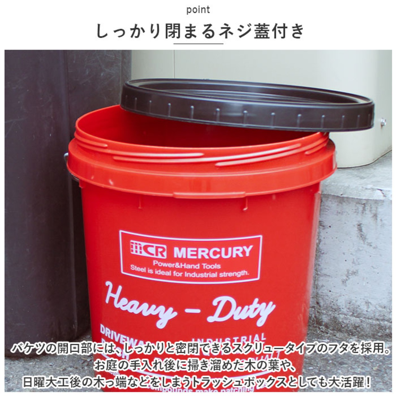 ・バケツの開口部には、しっかりと密閉できるスクリュータイプのフタを採用。お庭の手入れ後に掃き溜めた木の葉や、日曜大工後の木っ端などをしまうトラッシュボックスとしても大活躍!