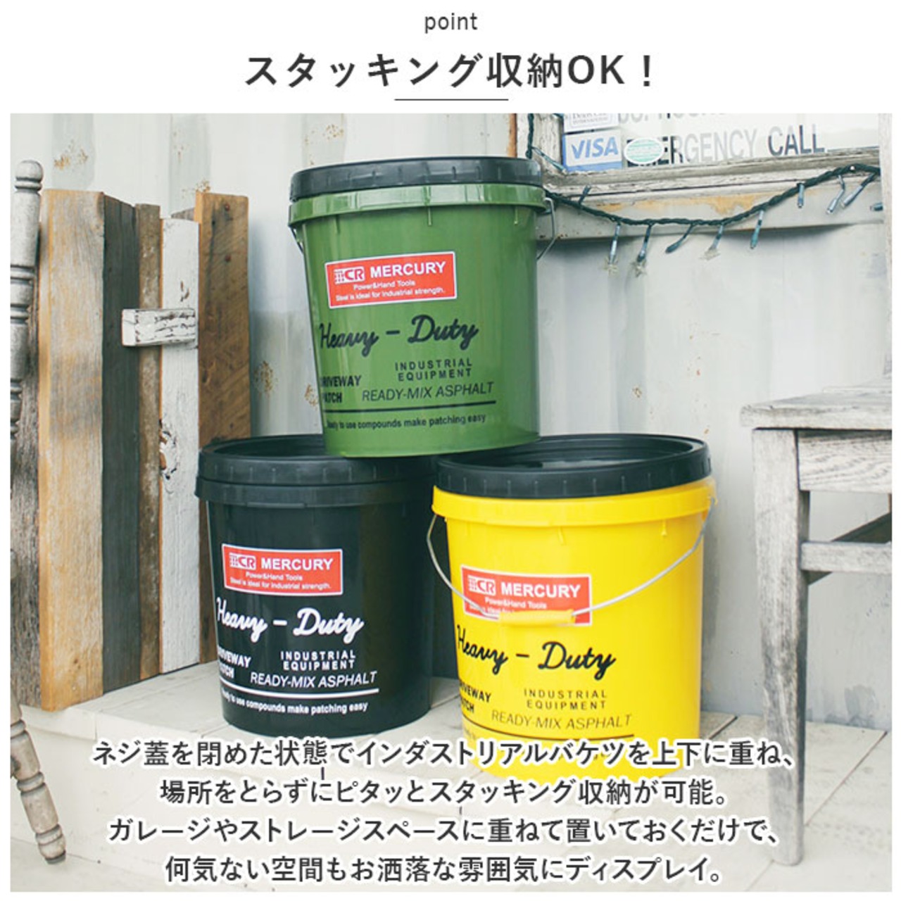 ・ネジ蓋を閉めた状態でインダストリアルバケツを上下に重ね、場所をとらずにピタッとスタッキング収納が可能。ガレージやストレージスペースに重ねて置いておくだけで、何気ない空間もお洒落な雰囲気にディスプレイ。