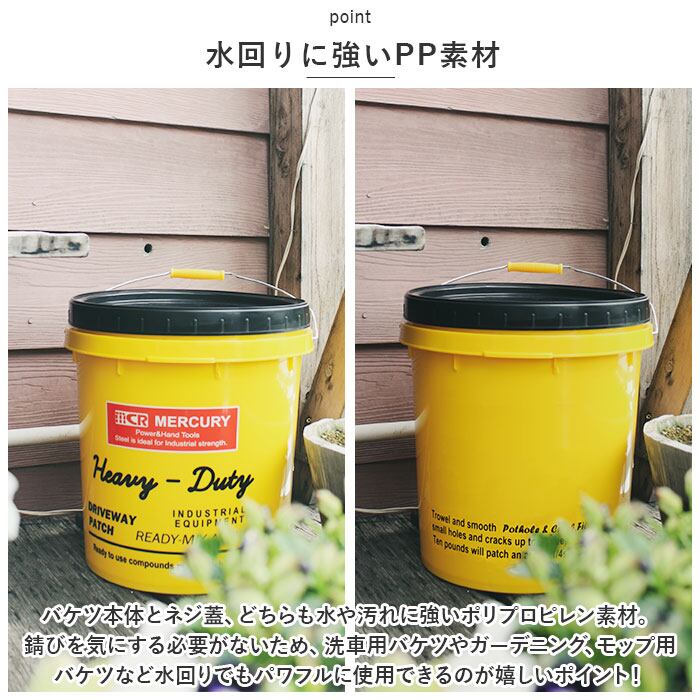 ・バケツ本体とネジ蓋、どちらも水や汚れに強いポリプロピレン素材。錆びを気にする必要がないため、洗車用バケツやガーデニング、モップ用バケツなど水回りでもパワフルに使用できるのが嬉しいポイント!
