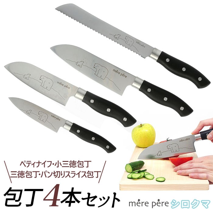 包丁セット 4本 通販 メルペール シロクマ しろくま かわいい モリブデン鋼 切れ味 軽量 軽い 持ちやすい 包丁 4点セット パン切り包丁 三徳包丁 小三徳包丁 ペティナイフ ナイフ 刃物 調理道具 調理器具