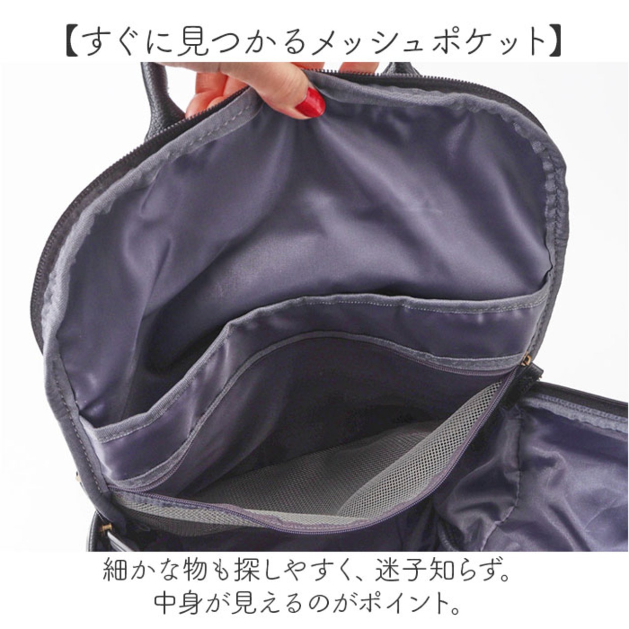 ・内側:ファスナー式メッシュポケット×1、ギャザーポケット×1、クッションポケット×1