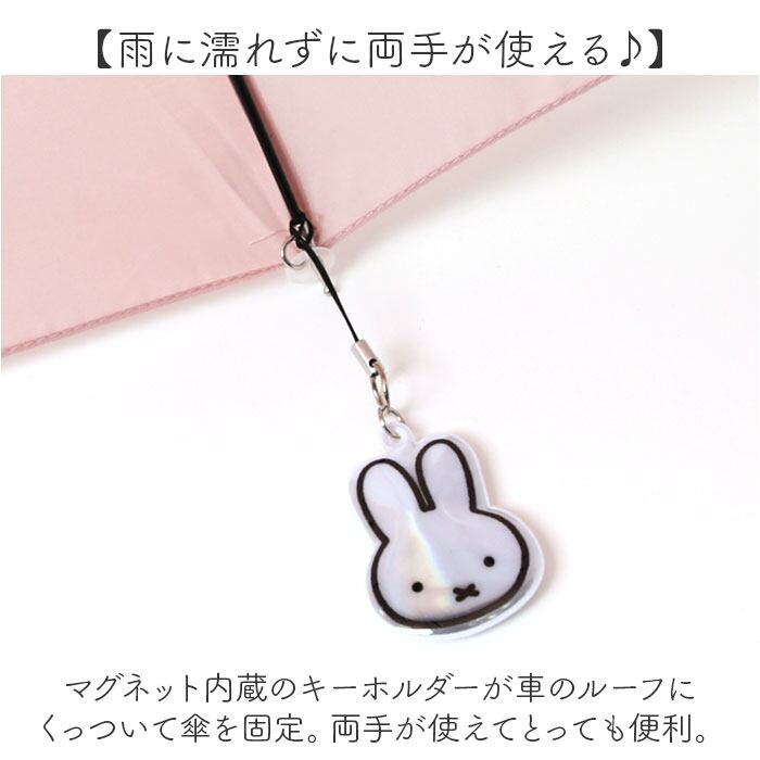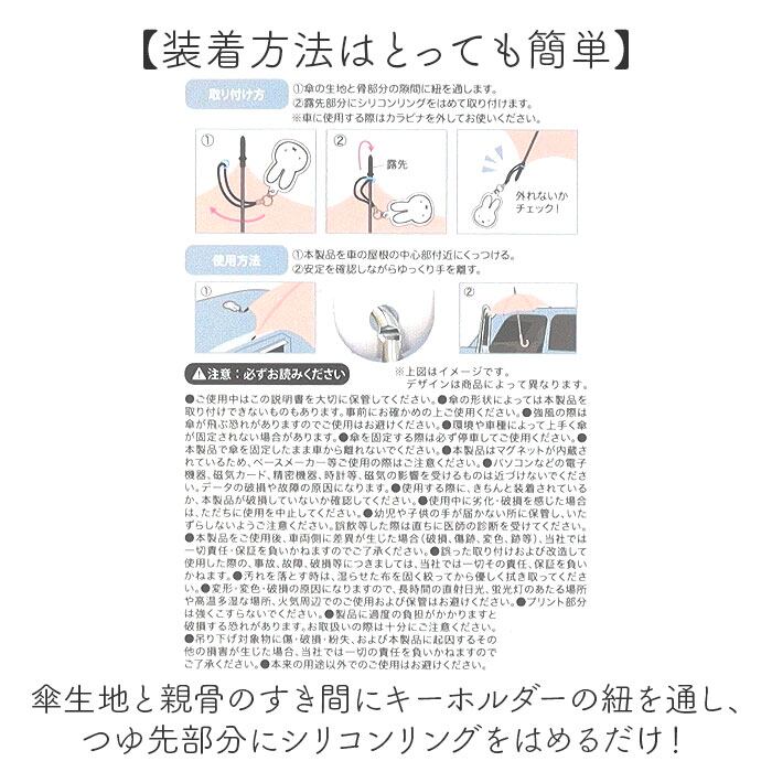 ・マグネット内蔵のキーホルダーが車のルーフにくっついて傘を固定。両手が使えてとっても便利。