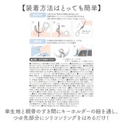 ・傘生地と親骨のすき間にキーホルダーの紐を通し、つゆ先部分にシリコンリングをはめるだけ!