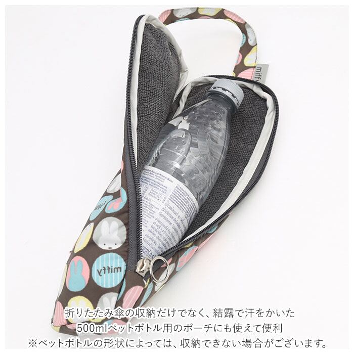 ・折りたたみ傘の収納だけでなく、結露で汗をかいた500mlペットボトル用のポーチにも使えて便利。(※ペットボトルの形状によっては、収納できない場合がございます。)