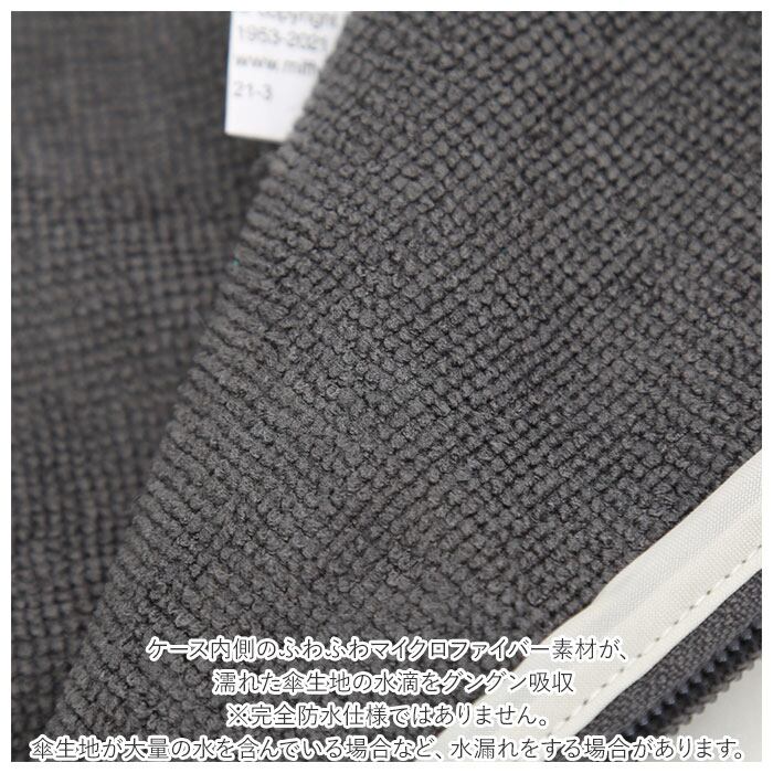 ・ケース内側のふわふわマイクロファイバー素材が、濡れた傘生地の水滴をグングン吸収。(※完全防水仕様ではありません。傘生地が大量の水を含んでいる場合など、水漏れをする場合があります。)
