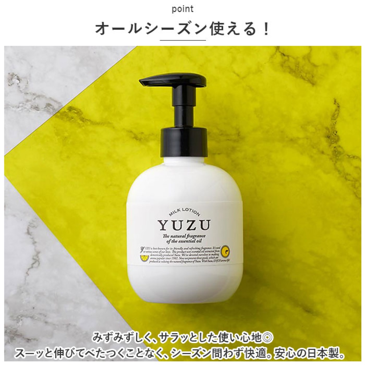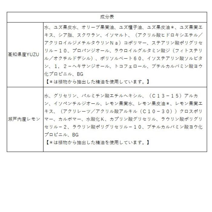 ・高知県産YUZU…高知県産ユズ精油配合の、爽やかな香り。ユズセラミド、ユズ種子油がしっとりと保湿。