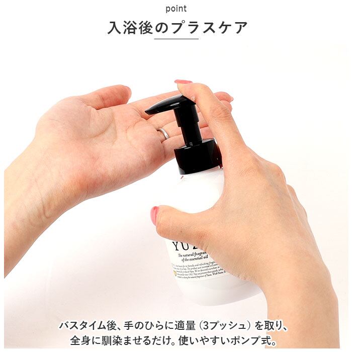 ・バスタイム後、手のひらに適量(3プッシュ)を取り、全身に馴染ませるだけ。使いやすいポンプ式。