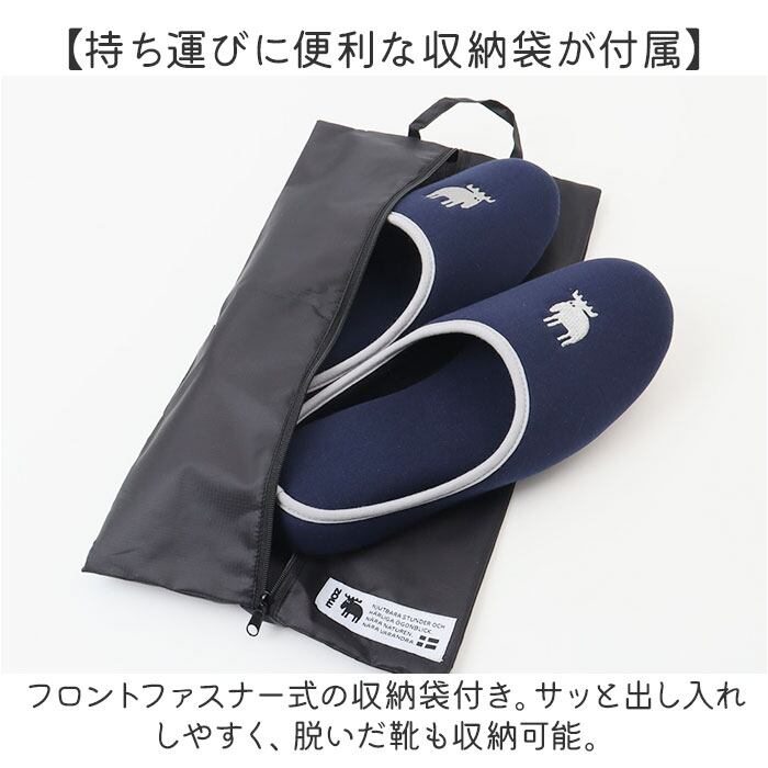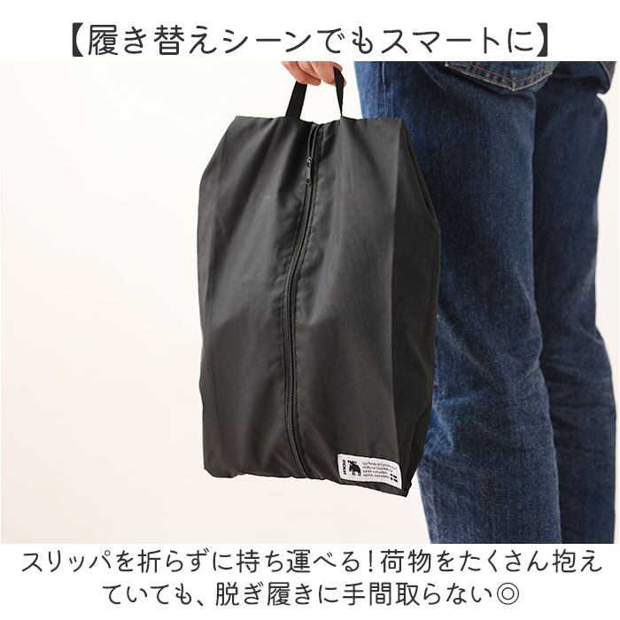 ・フロントファスナー式の収納袋付き。サッと出し入れしやすく、脱いだ靴も収納可能。