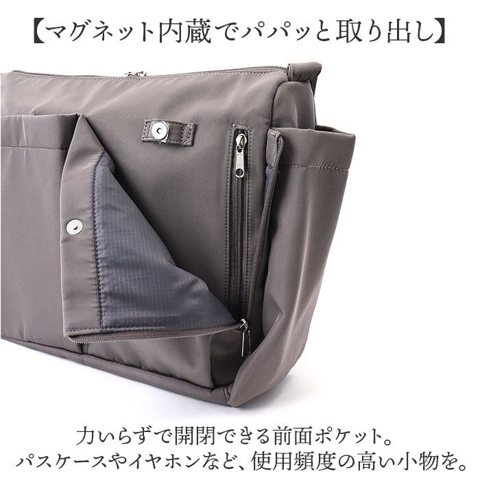 ・力いらずで開閉できる前面ポケット。パスケースやイヤホンなど、使用頻度の高い小物を。