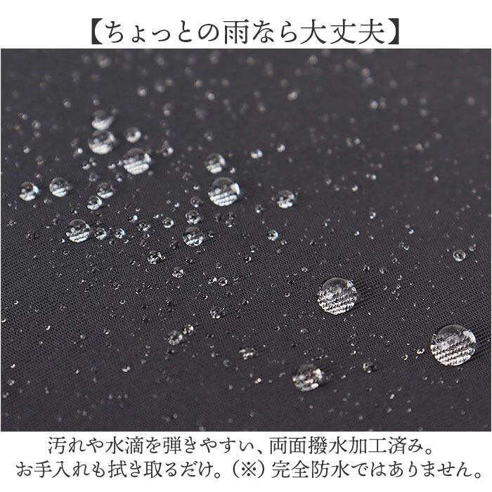 ・汚れや水滴を弾きやすい、両面撥水加工済み。お手入れも拭き取るだけ。