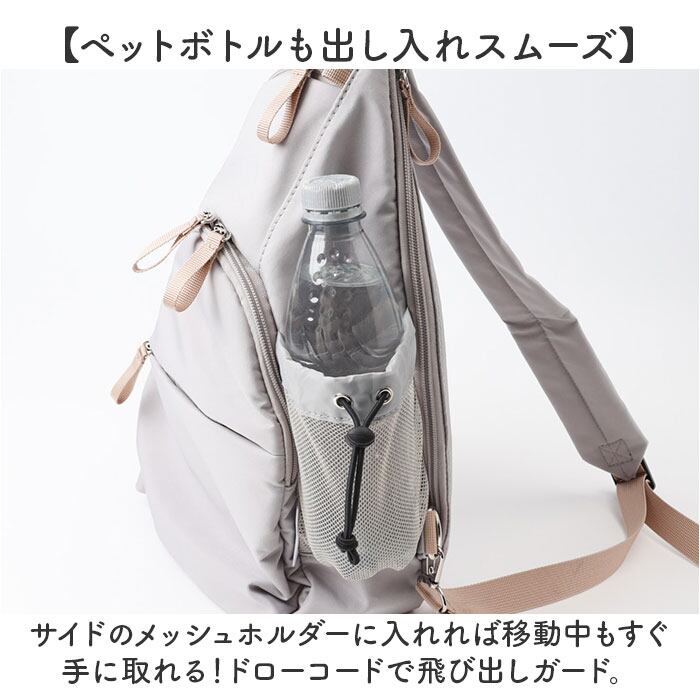 ・サイドのメッシュホルダーに入れれば移動中もすぐ手に取れる!ドローコードで飛び出しガード。