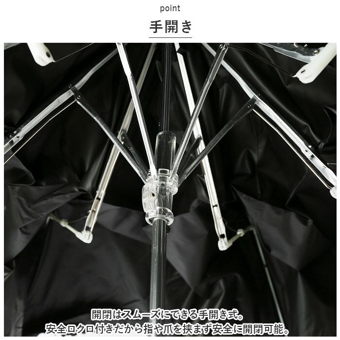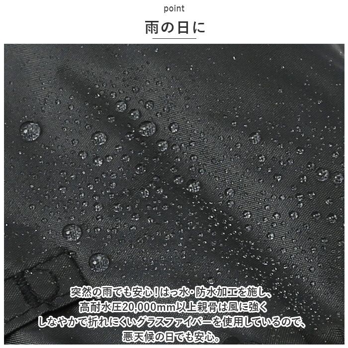 ・突然の雨でも安心!はっ水・防水加工を施し、高耐水圧20,000mm以上親骨は風に強くしなやかで折れにくいグラスファイバーを使用しているので、悪天候の日でも安心。