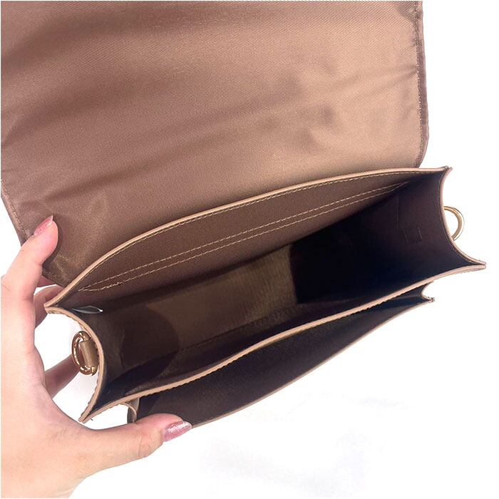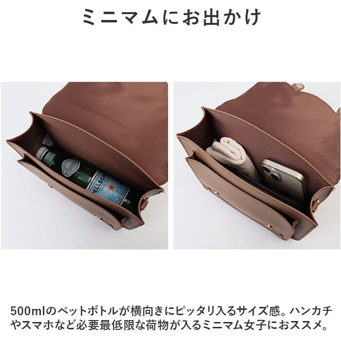 500mlのペットボトルが横向きにピッタリ入るサイズ感。ハンカチやスマホなど必要最低限な荷物が入るミニマム女子におススメ。
