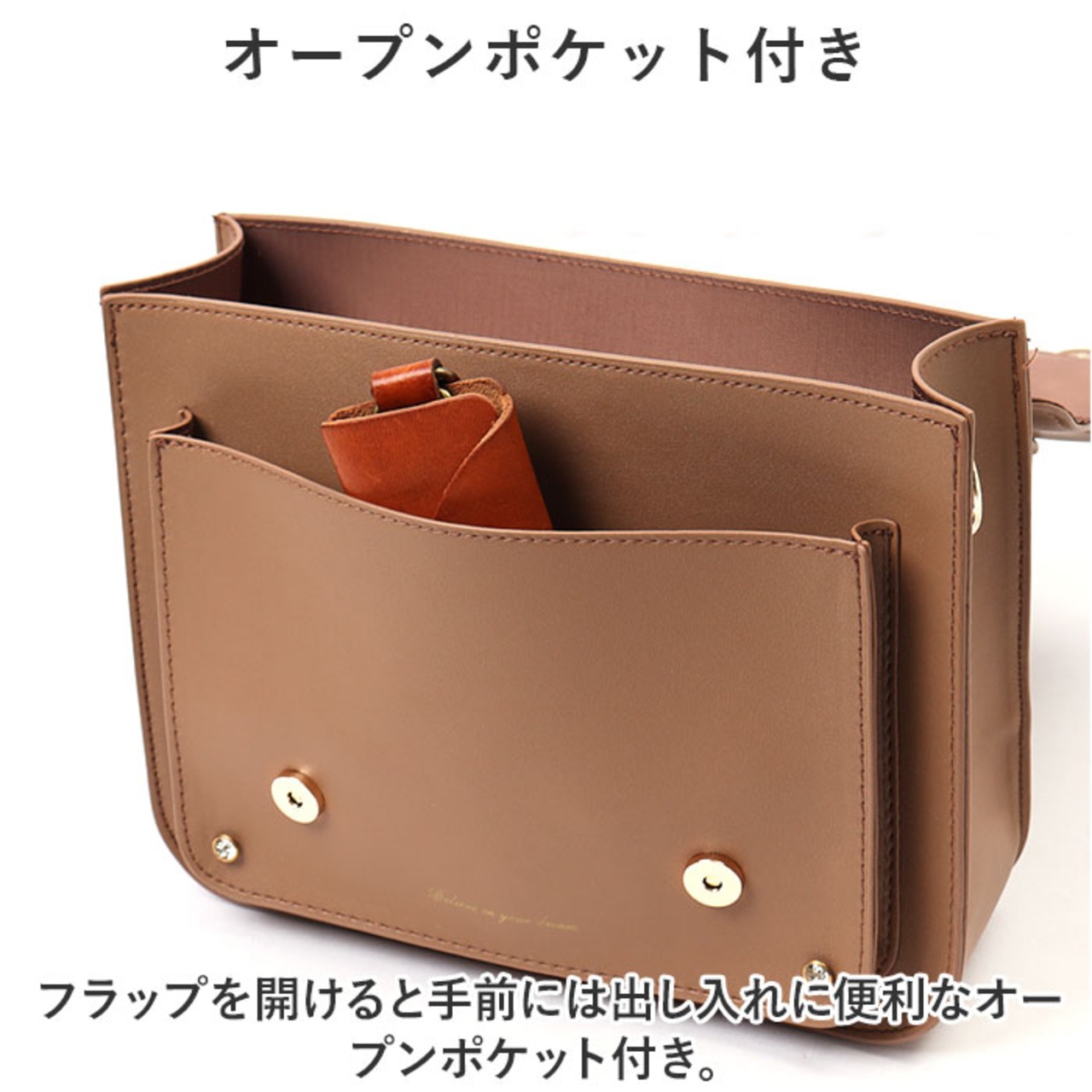 ・フラップを開けると手前には出し入れに便利なオープンポケット付き。