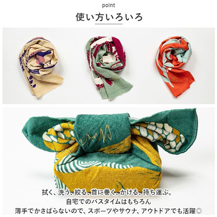 ・拭く、洗う、絞る、首に巻く、かける、持ち運ぶ。自宅でのバスタイムはもちろん薄手でかさばらないので、スポーツやサウナ、アウトドアでも活躍◎