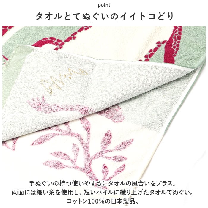 ・手ぬぐいの持つ使いやすさにタオルの風合いをプラス。両面には細い糸を使用し、短いパイルに織り上げたタオルてぬぐい。コットン100%の日本製品。