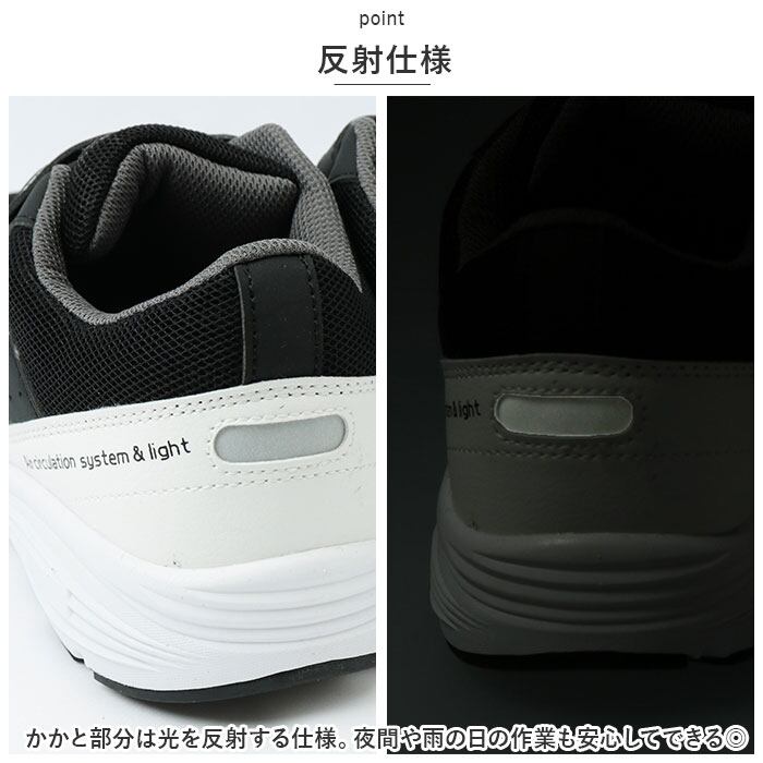 ・アッパーのメッシュ加工で、通気性がよく足ムレを防止。高温になる真夏の作業時も足元快適!