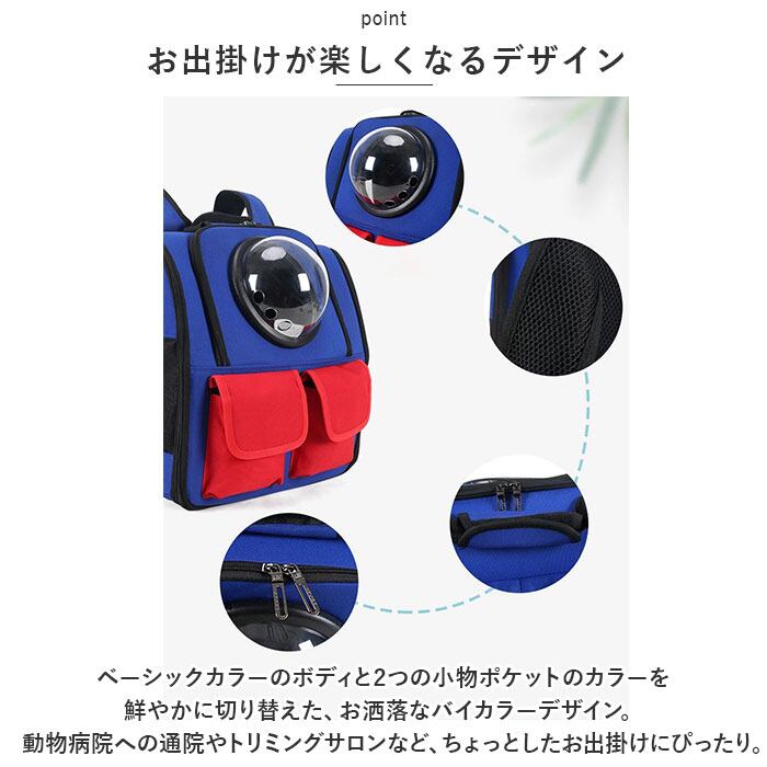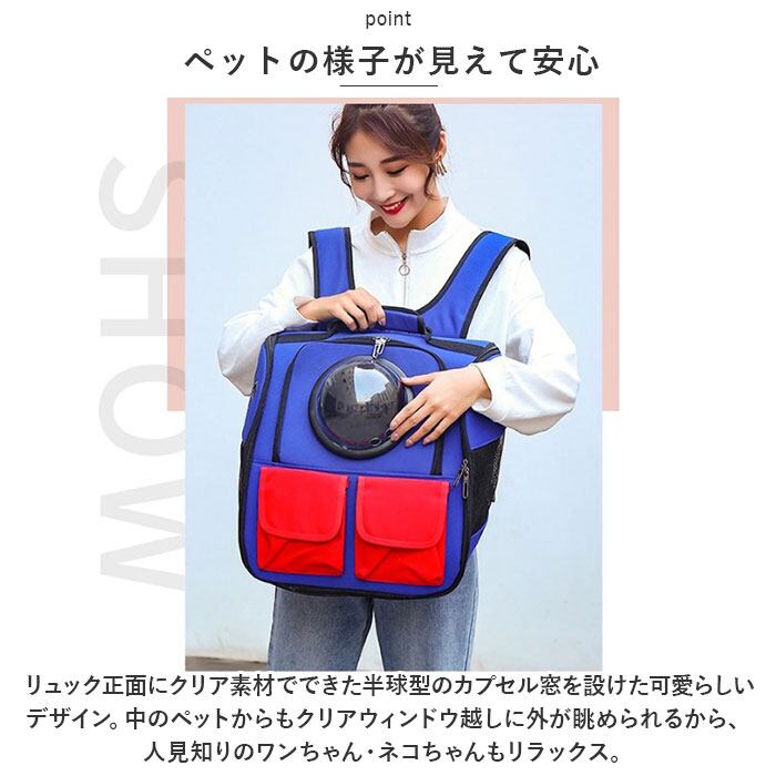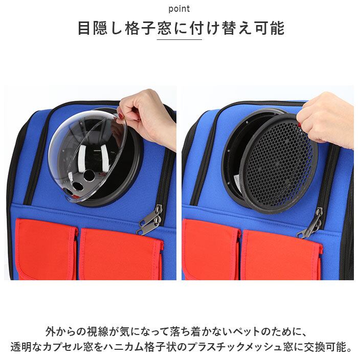 ・リュック正面にクリア素材でできた半球型のカプセル窓を設けた可愛らしいデザイン。中のペットからもクリアウィンドウ越しに外が眺められるから、人見知りのワンちゃん・ネコちゃんもリラックス。