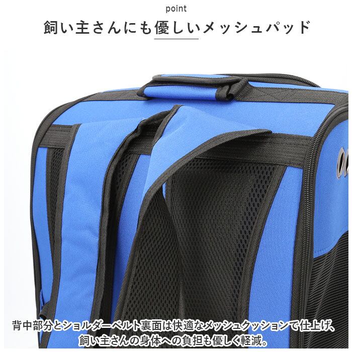 ・背中部分とショルダーベルト裏面は快適なメッシュクッションで仕上げ、飼い主さんの身体への負担も優しく軽減。