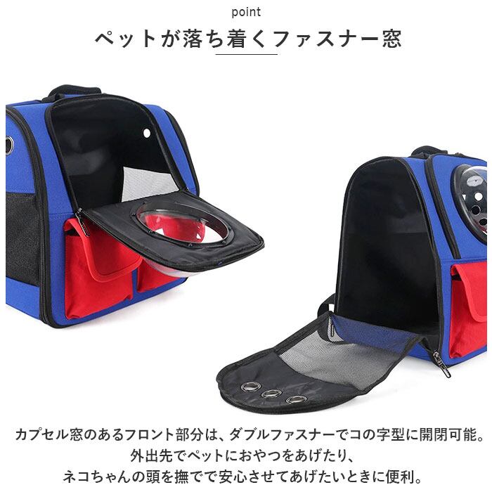 ・カプセル窓のあるフロント部分は、ダブルファスナーでコの字型に開閉可能。外出先でペットにおやつをあげたり、ネコちゃんの頭を撫でで安心させてあげたいときに便利。