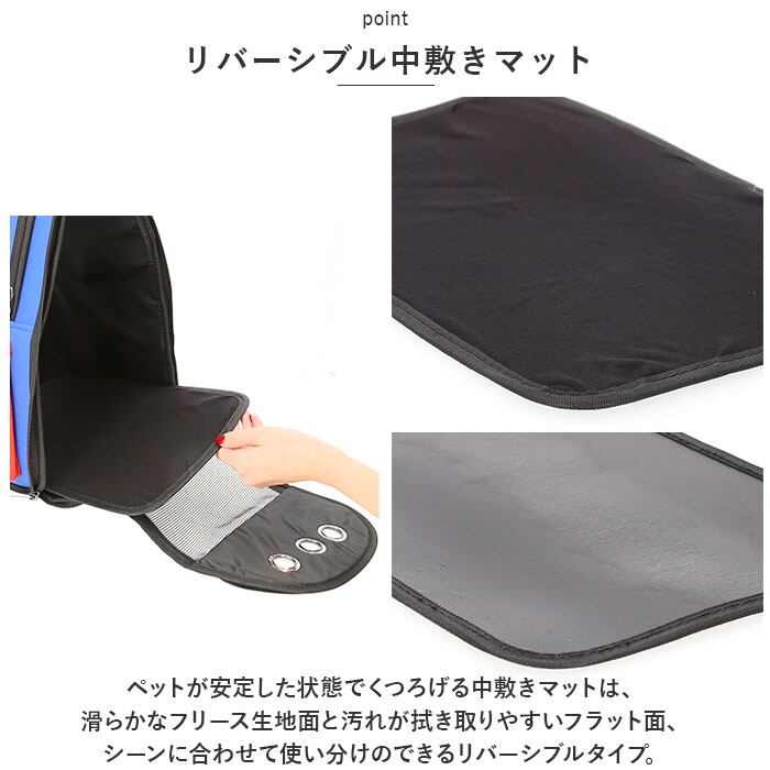 ・ペットが安定した状態でくつろげる中敷きマットは、滑らかなフリース生地面と汚れが拭き取りやすいフラット面、シーンに合わせて使い分けのできるリバーシブルタイプ。