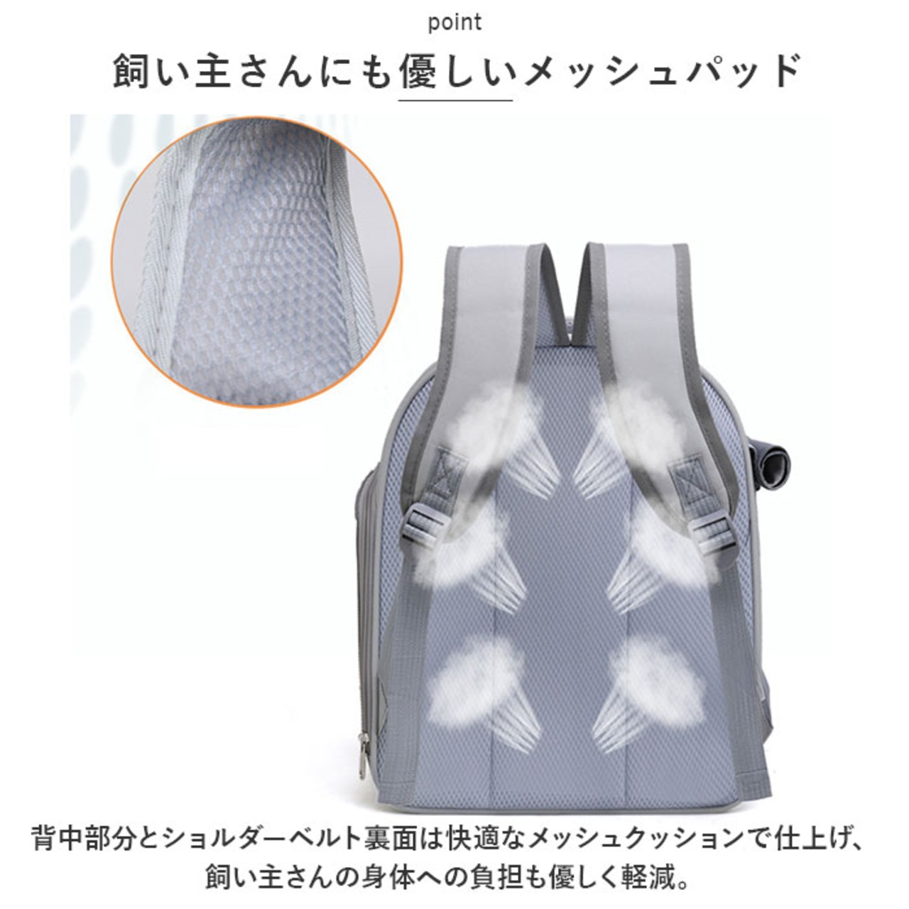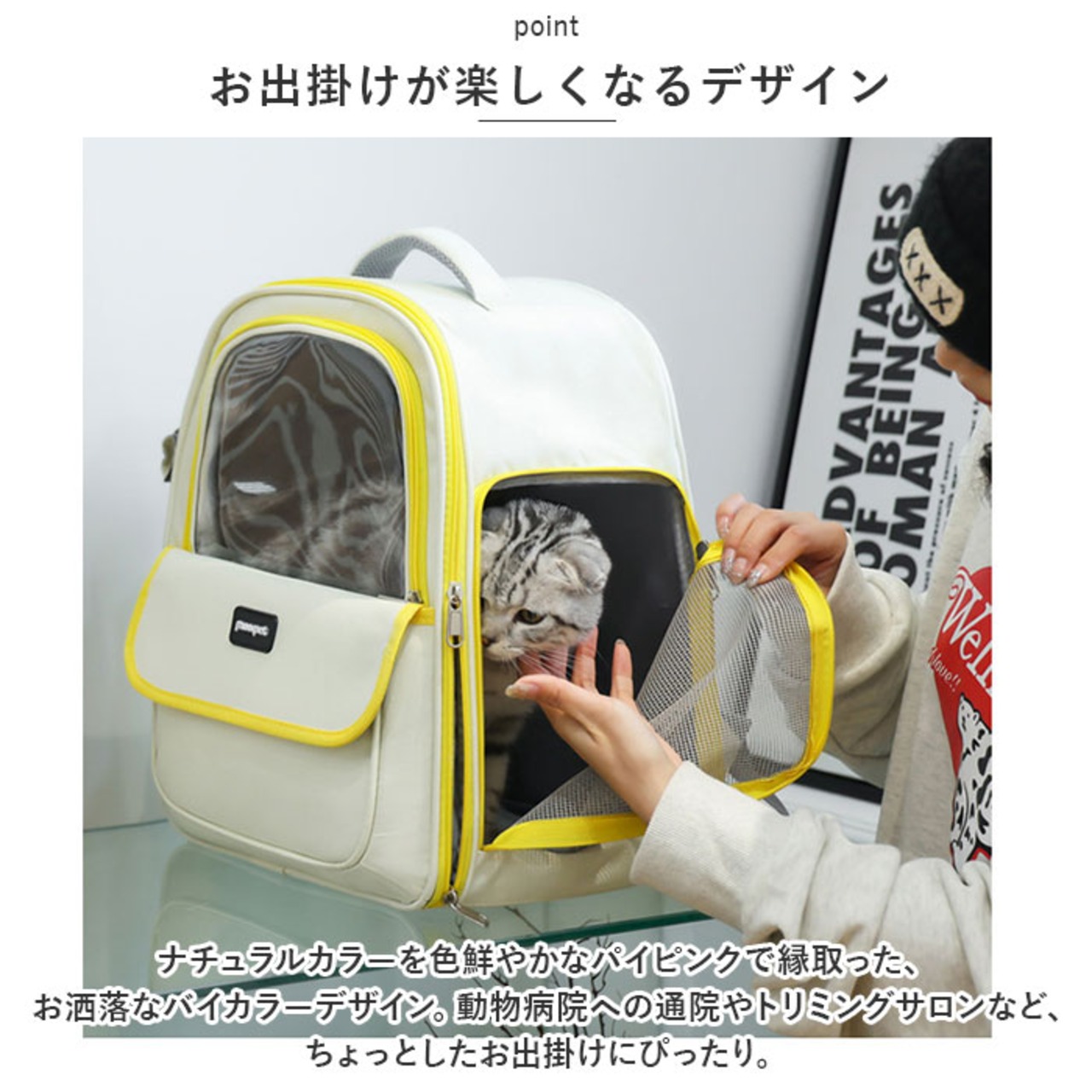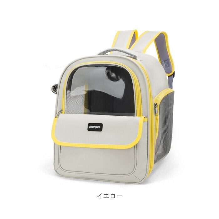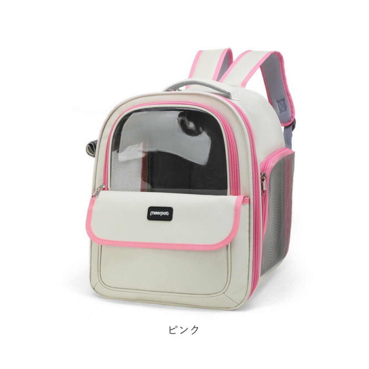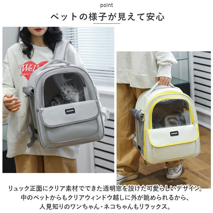 ・リュック正面にクリア素材でできた透明窓を設けた可愛らしいデザイン。中のペットからもクリアウィンドウ越しに外が眺められるから、人見知りのワンちゃん・ネコちゃんもリラックス。
